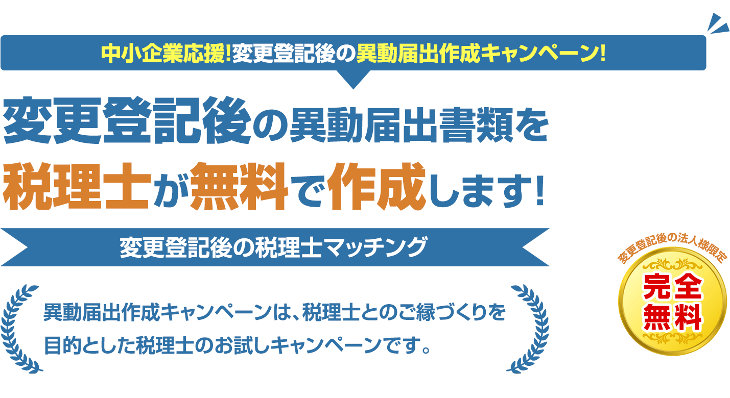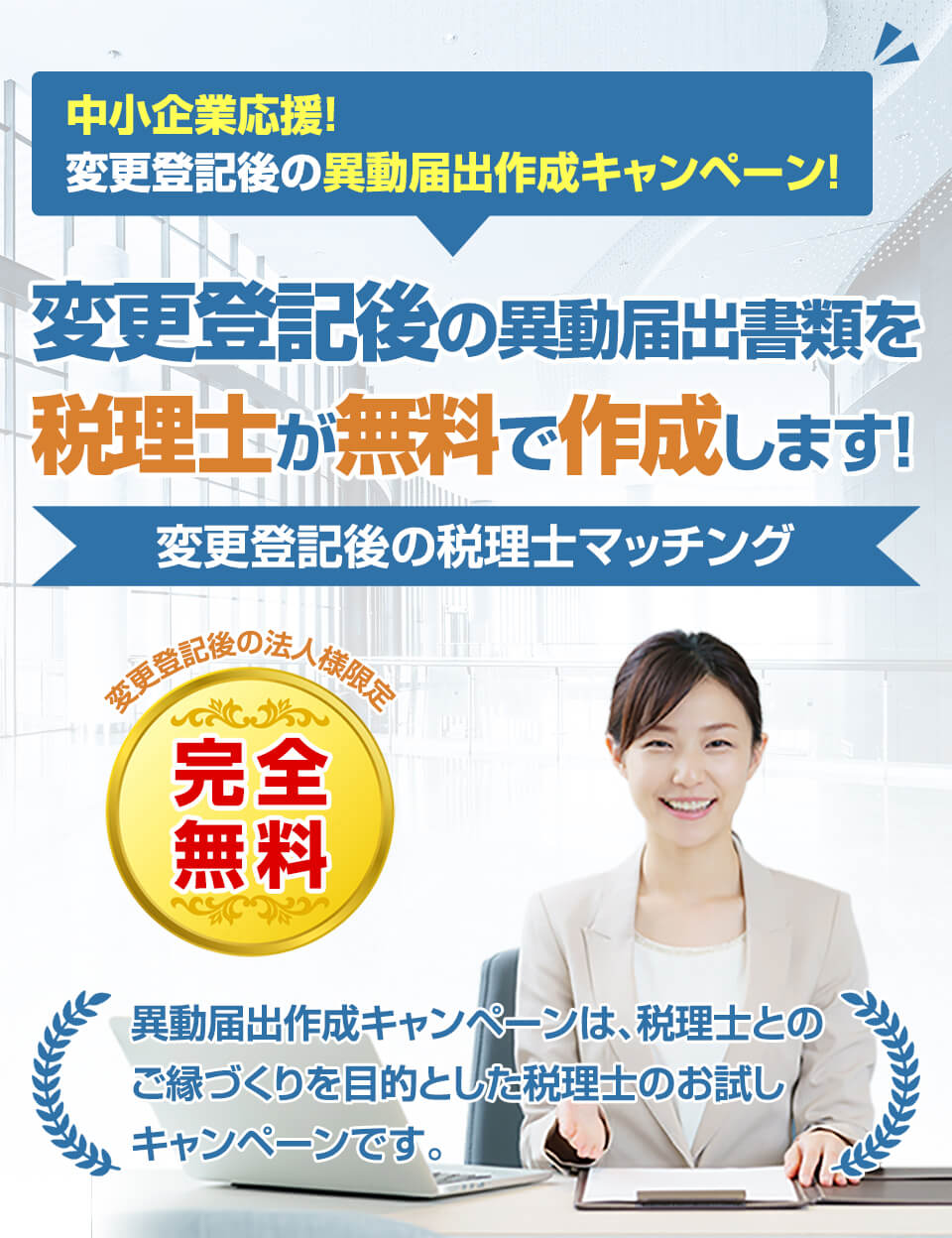 「変更登記後のお助け隊」は累計4万社以上の中小企業の税理士マッチング実績があり、対応する税理士も中小企業を応援するリーズナブルな税理士です。異動届出作成キャンペーンは税理士とのご縁づくりを目的として、届出作成や税務相談を税理士が無料で提供します。